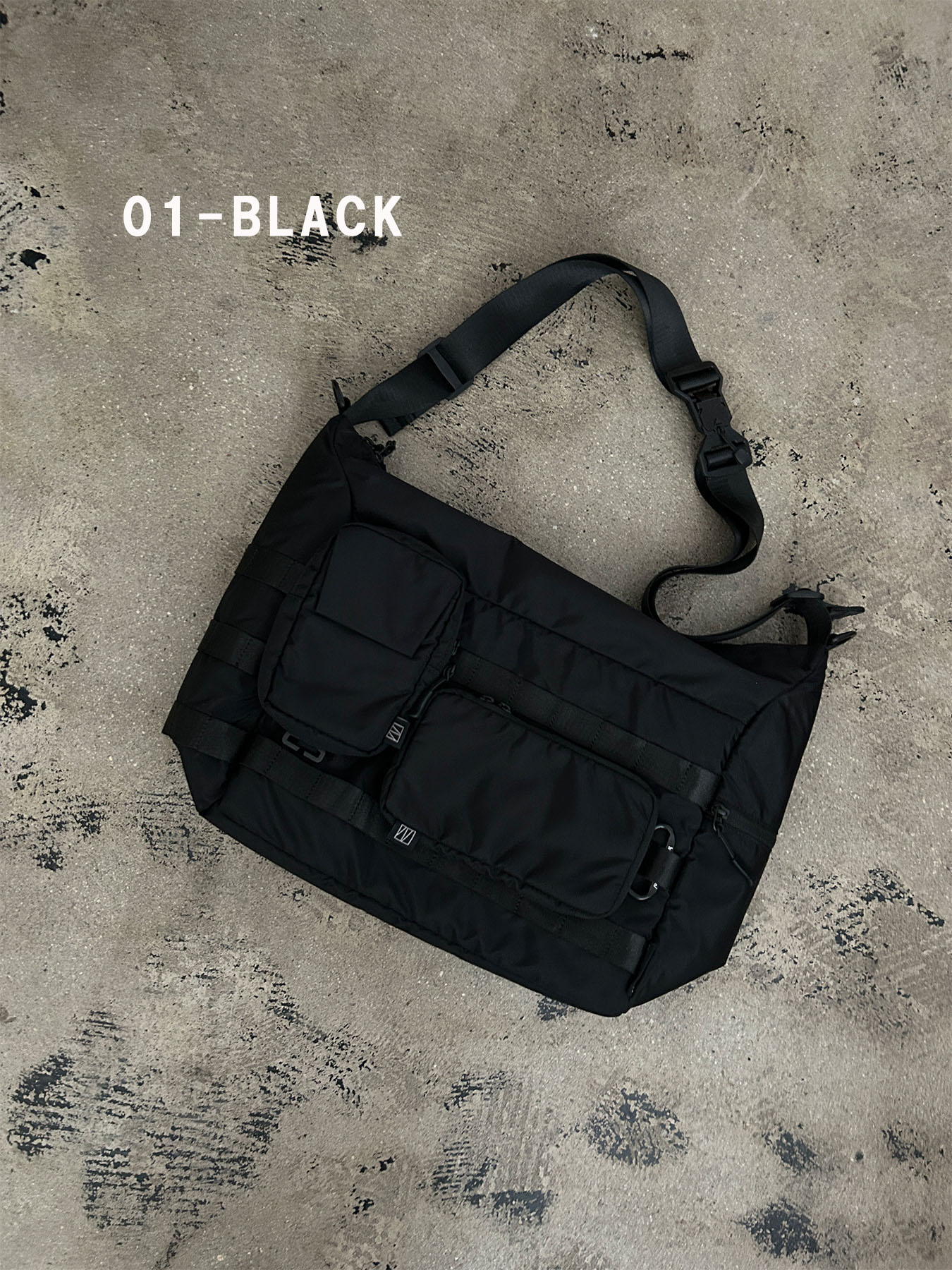 無駄を削ぎ落としたブラックボディに、ミリタリーテイストのギア感を落とし込んだテクニカルショルダーバッグ。